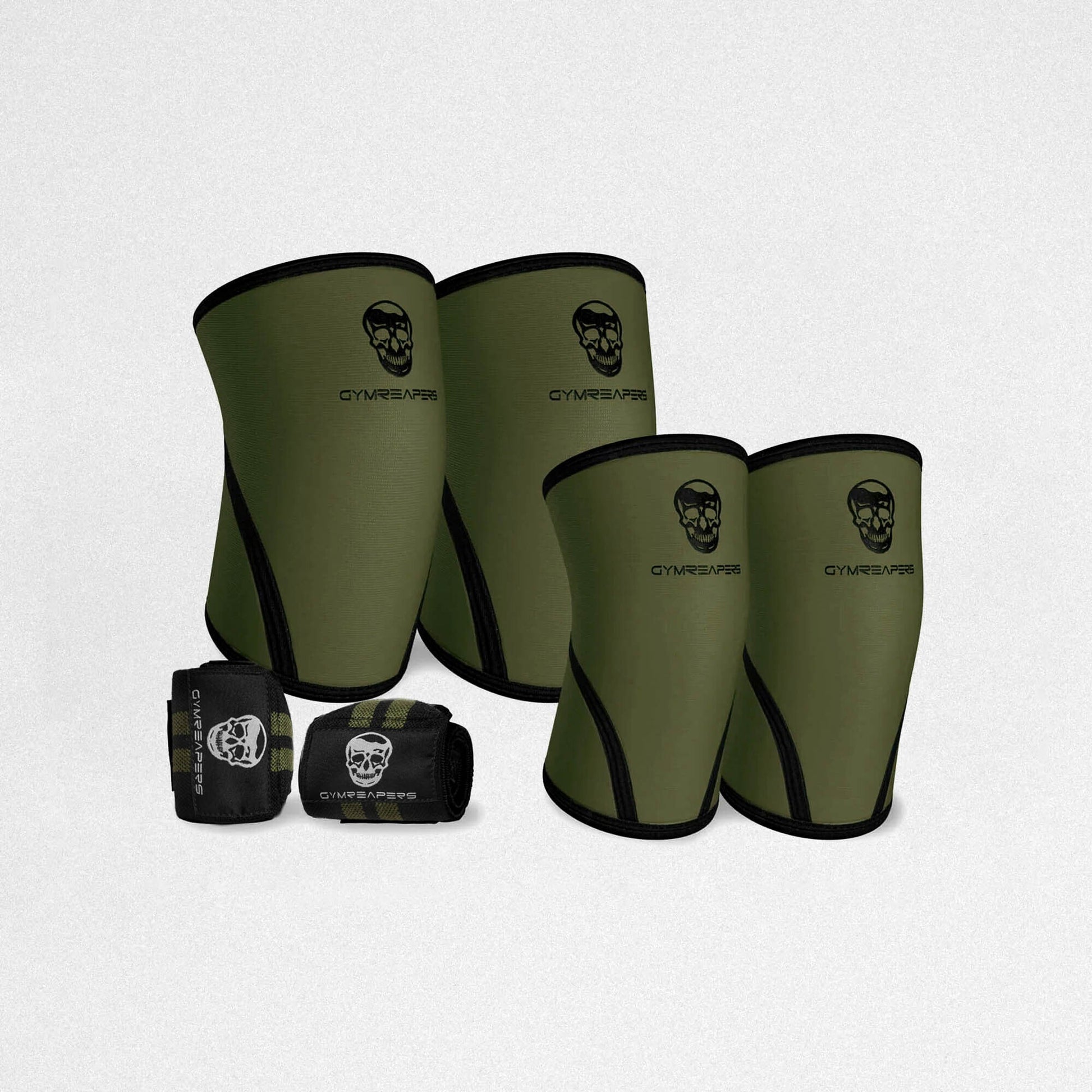 The Gymreapers Sleeve Kit includes premium 7mm Knee Sleeves, 5mm Elbow Sleeves, and 18" Wrist Wraps. Our top-rated Neoprene knee and elbow sleeves improve blood flow and reduce strain on your joints.