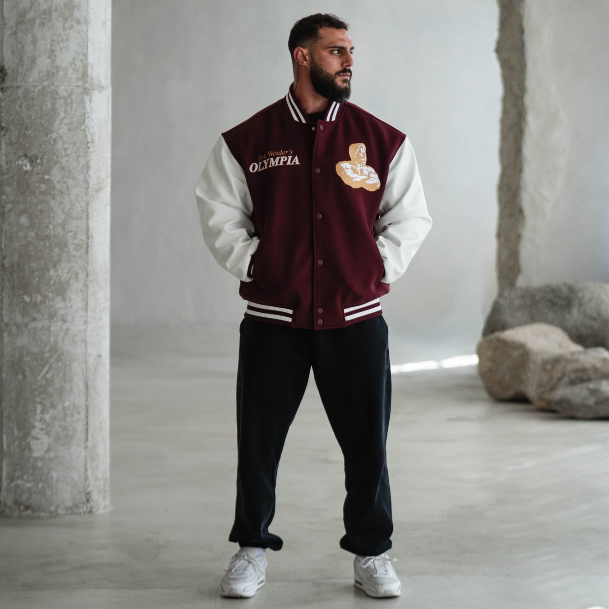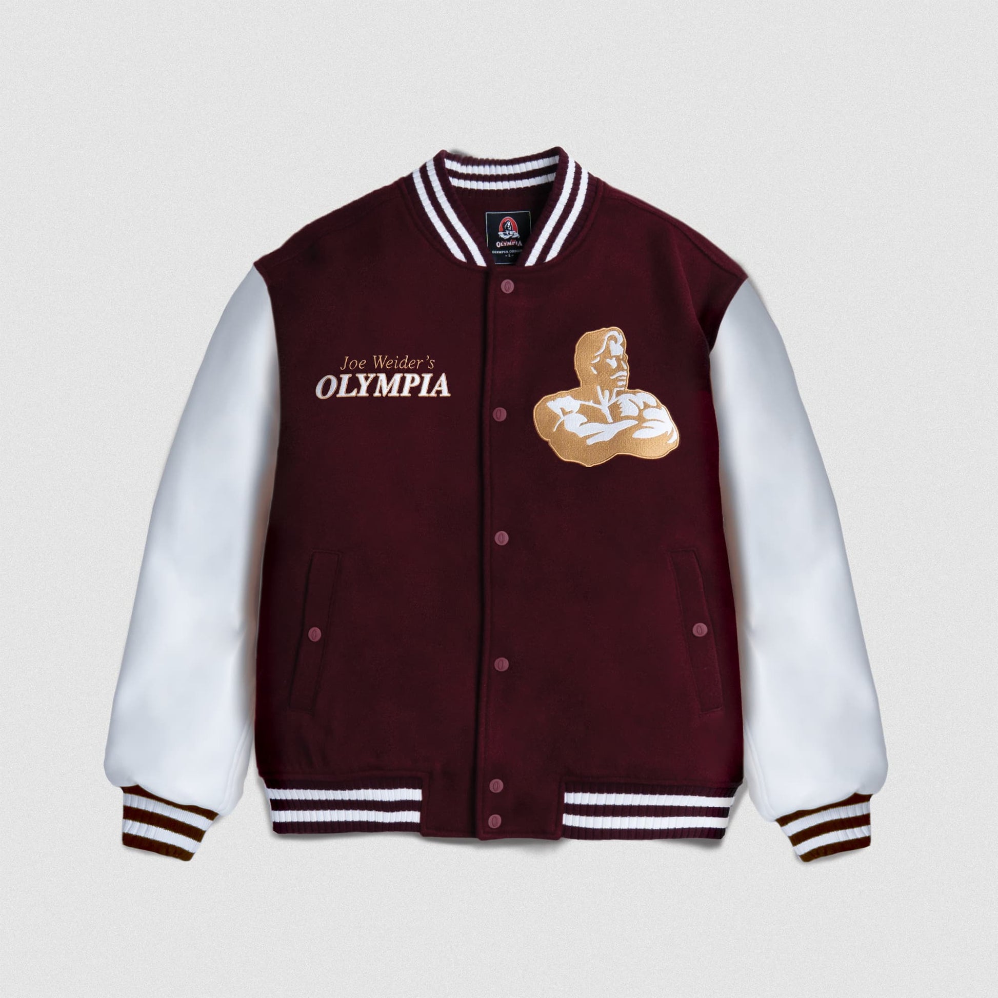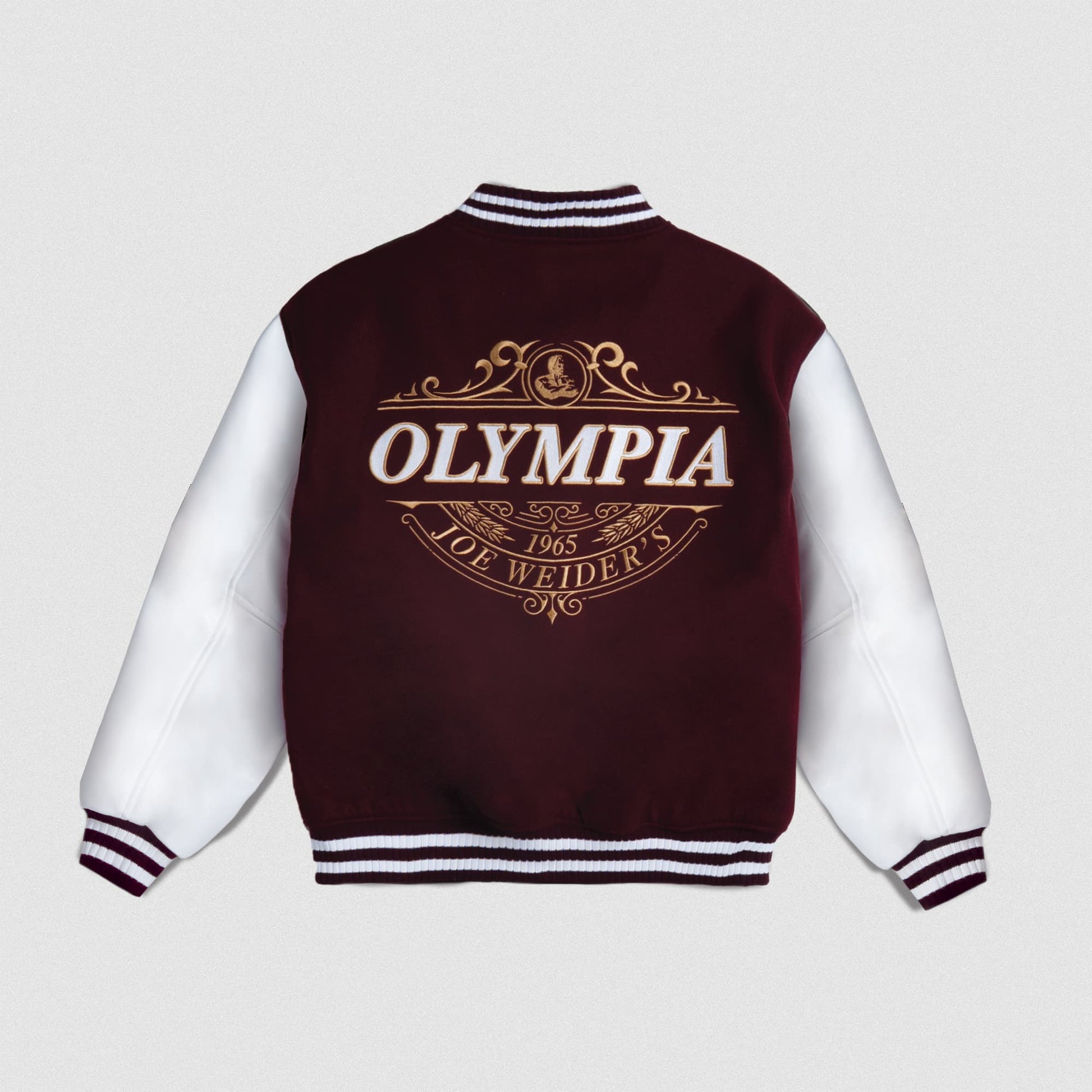 The Royal Olympia Varsity Jacket embodies the prestige and legacy of the Olympia stage with a regal design and heavyweight construction. Crafted from premium materials, it combines structure, warmth, and everyday durability. Featuring ornate embroidery across the back, a bold chest emblem, and contrast sleeves, this jacket stands out as both a tribute to champions and a modern streetwear staple.
